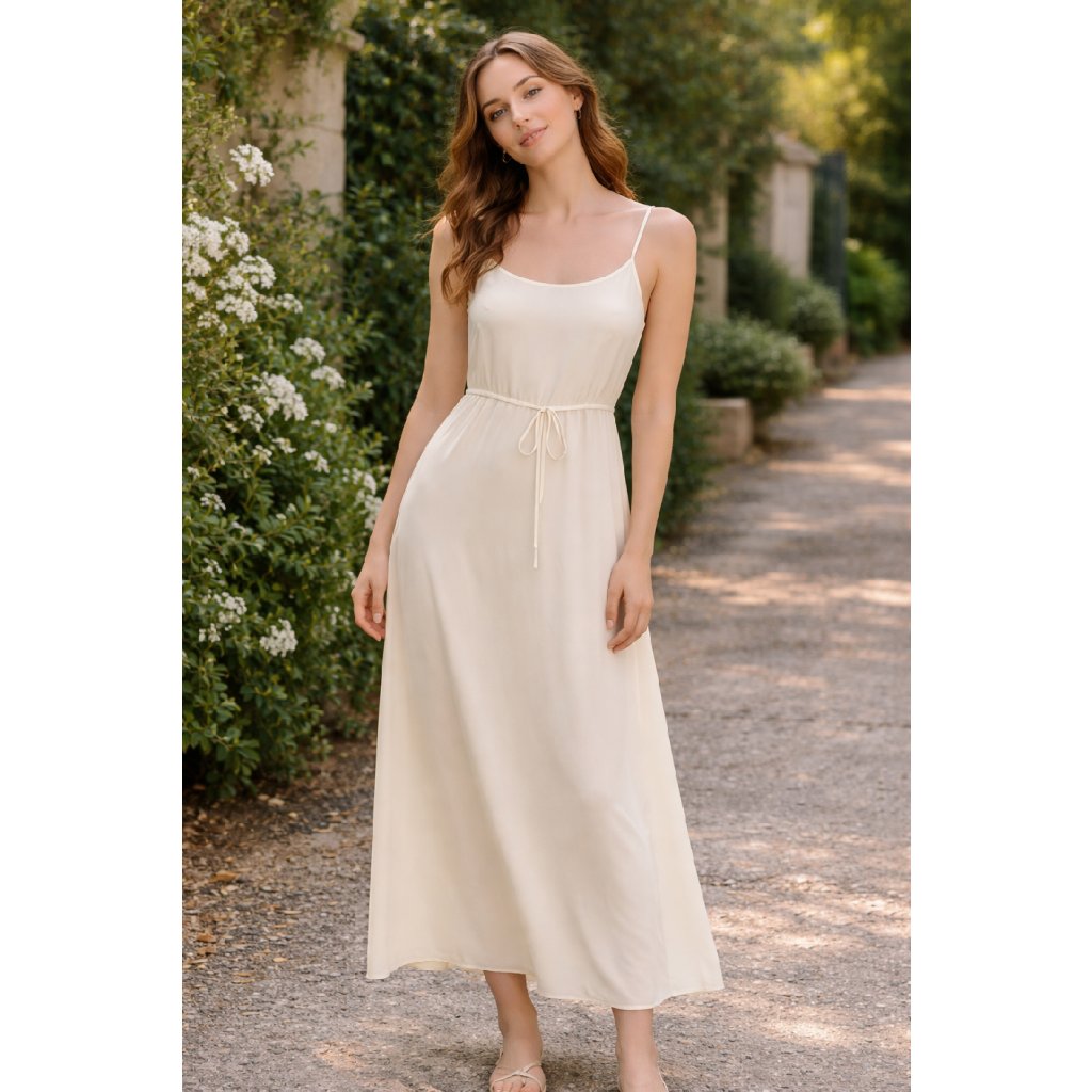 Lehké a vzdušné šaty v jemné smetanové barvě, ideální na teplejší dny. Mají jednoduchý, elegantní střih na úzká ramínka a v pase šňůrku na stažení, díky které si snadno přizpůsobíte siluetu. Délka cca 128 cm – krásně splývají a sahají ke kotníkům.