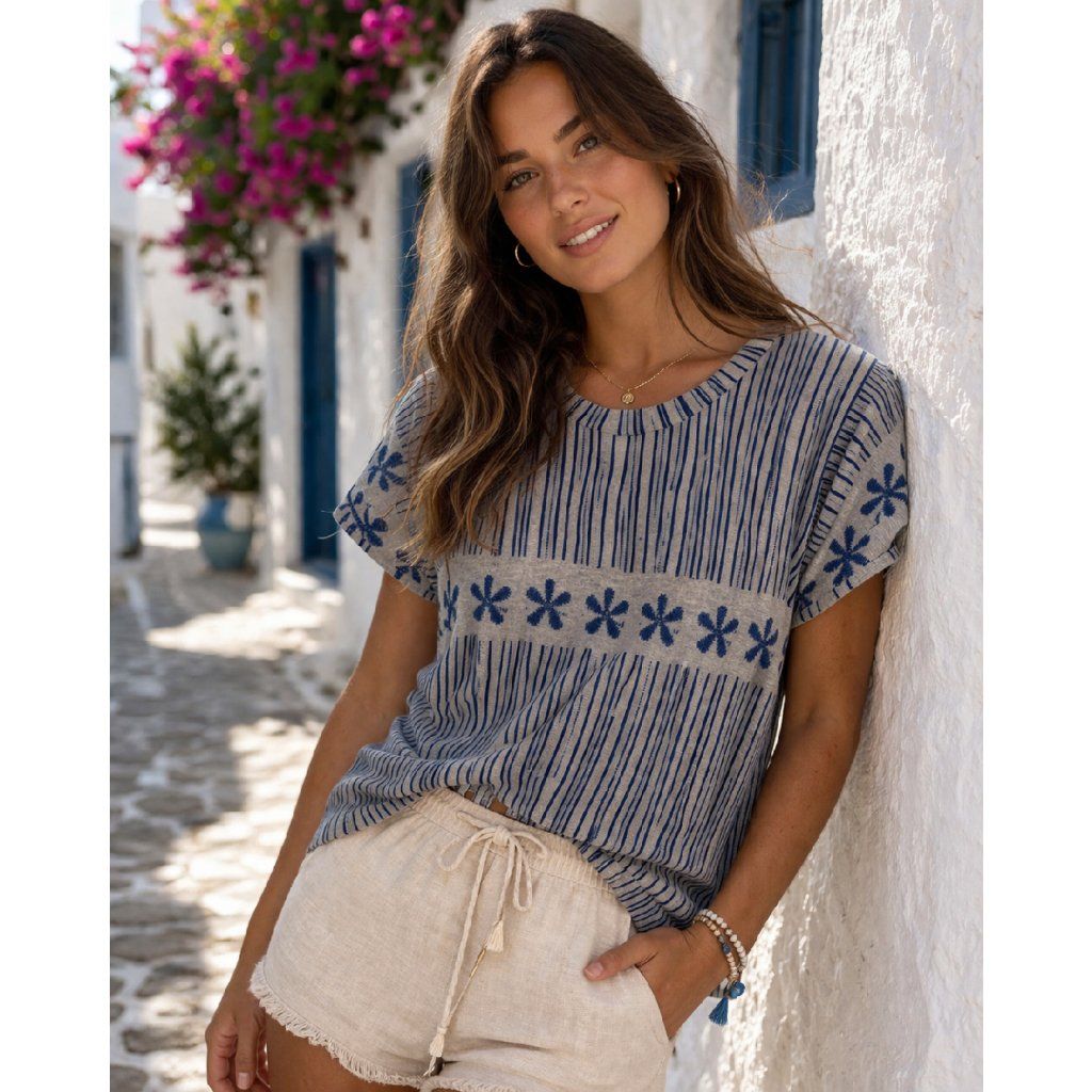 Lehké a svěží tričko s jemným vzorem, které okamžitě zaujme svou originalitou. Perfektní kousek pro letní dny – pohodlné, stylové a snadno kombinovatelné s každým outfitem. 💙✨