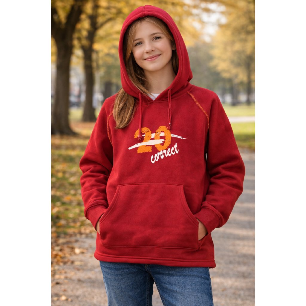 Stylová a pohodlná mikina v krásné červené barvě s potiskem „20 correct“. Ideální na běžné nošení do školy i ven, skvěle zahřeje v chladnějším počasí 🍁