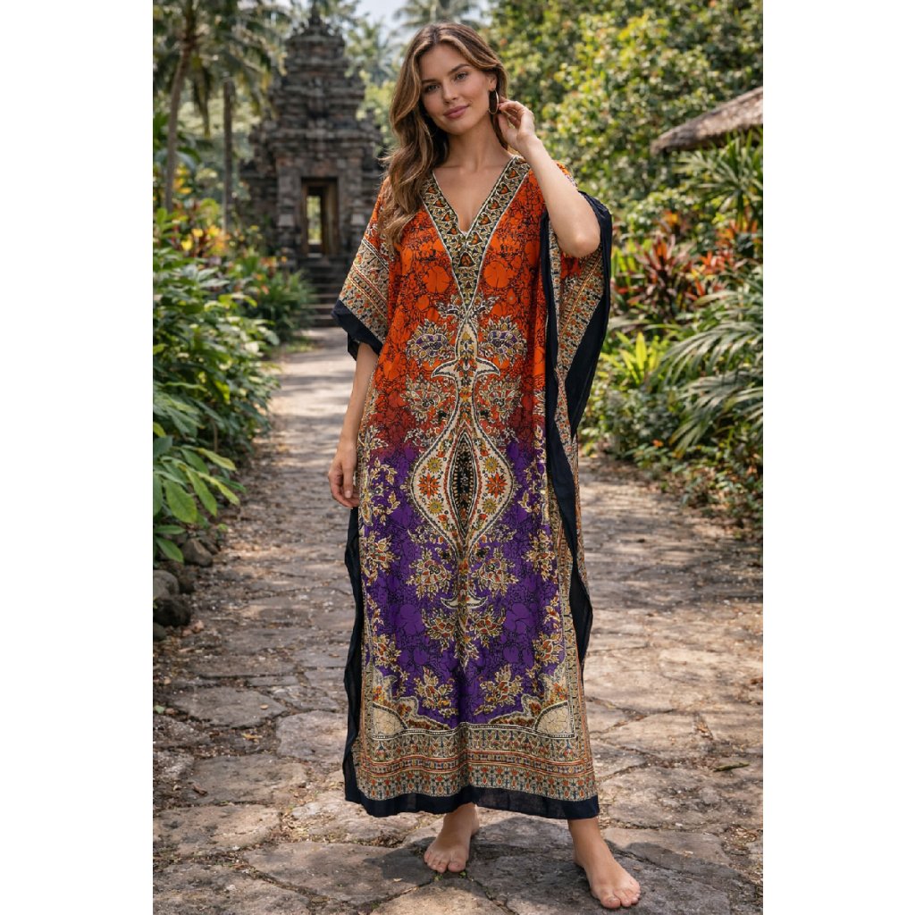 Lehký kaftan s výrazným vzorem, který rozzáří každý letní den. Ideální na pláž, dovolenou i pohodové procházky – stačí obléct a outfit je hotový.