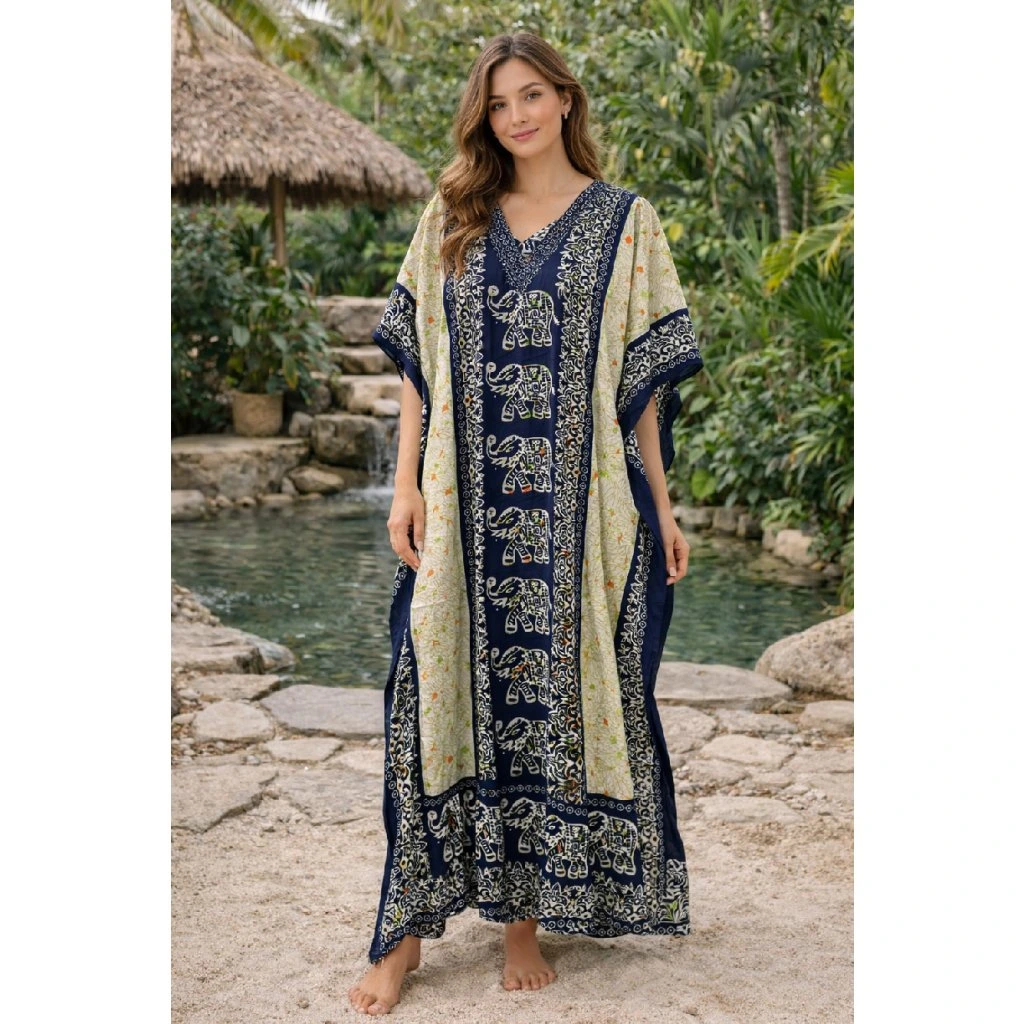 Lehký kaftan s výrazným vzorem, který rozzáří každý letní den. Ideální na pláž, dovolenou i pohodové procházky – stačí obléct a outfit je hotový.