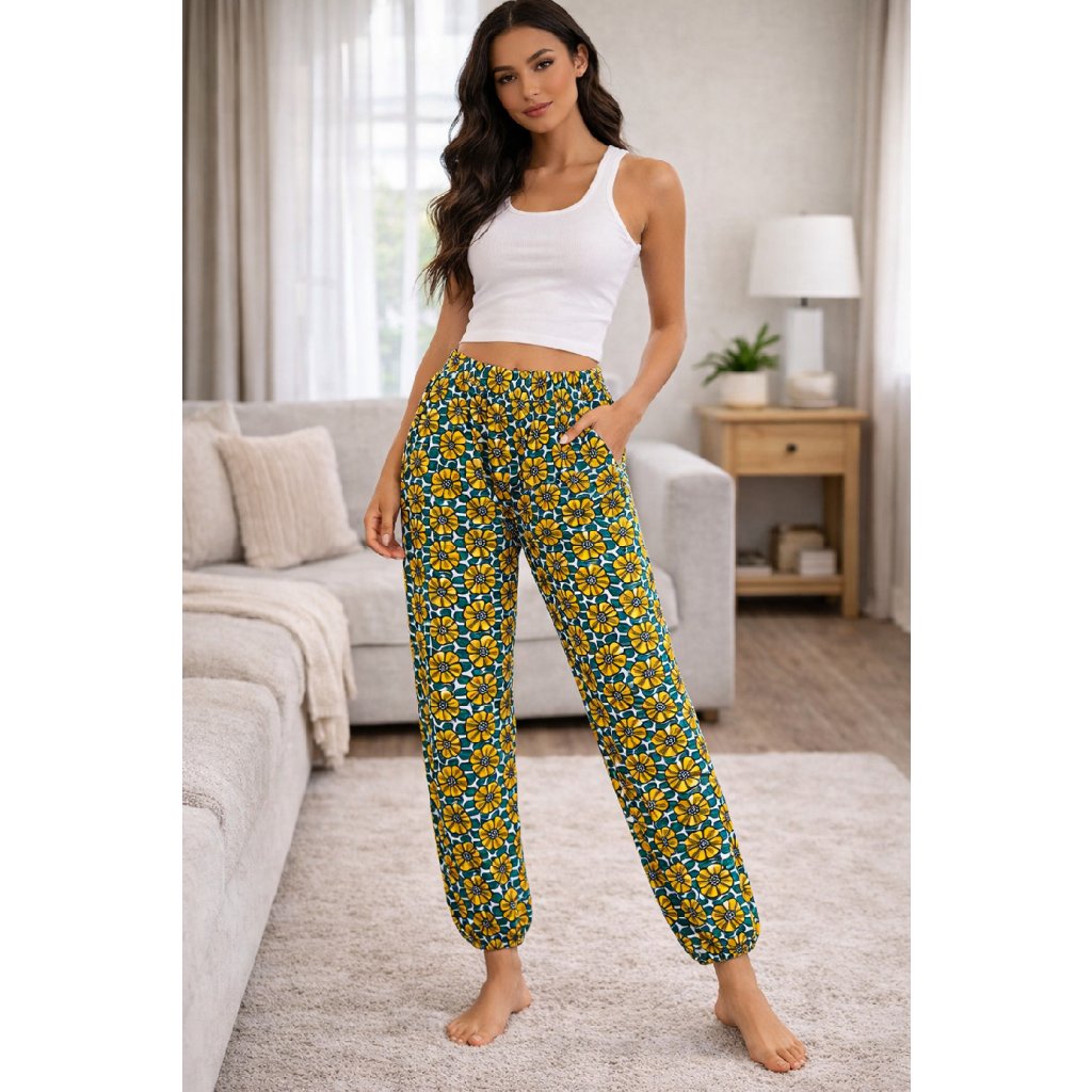 Pohodlné dámské kalhoty ideální na domácí nošení, relax i volný čas. Příjemný lehký materiál a volnější střih zajišťují maximální komfort během celého dne. Elastický pas se snadno přizpůsobí postavě a zakončení nohavic do gumy dodává kalhotám praktický a moderní vzhled.