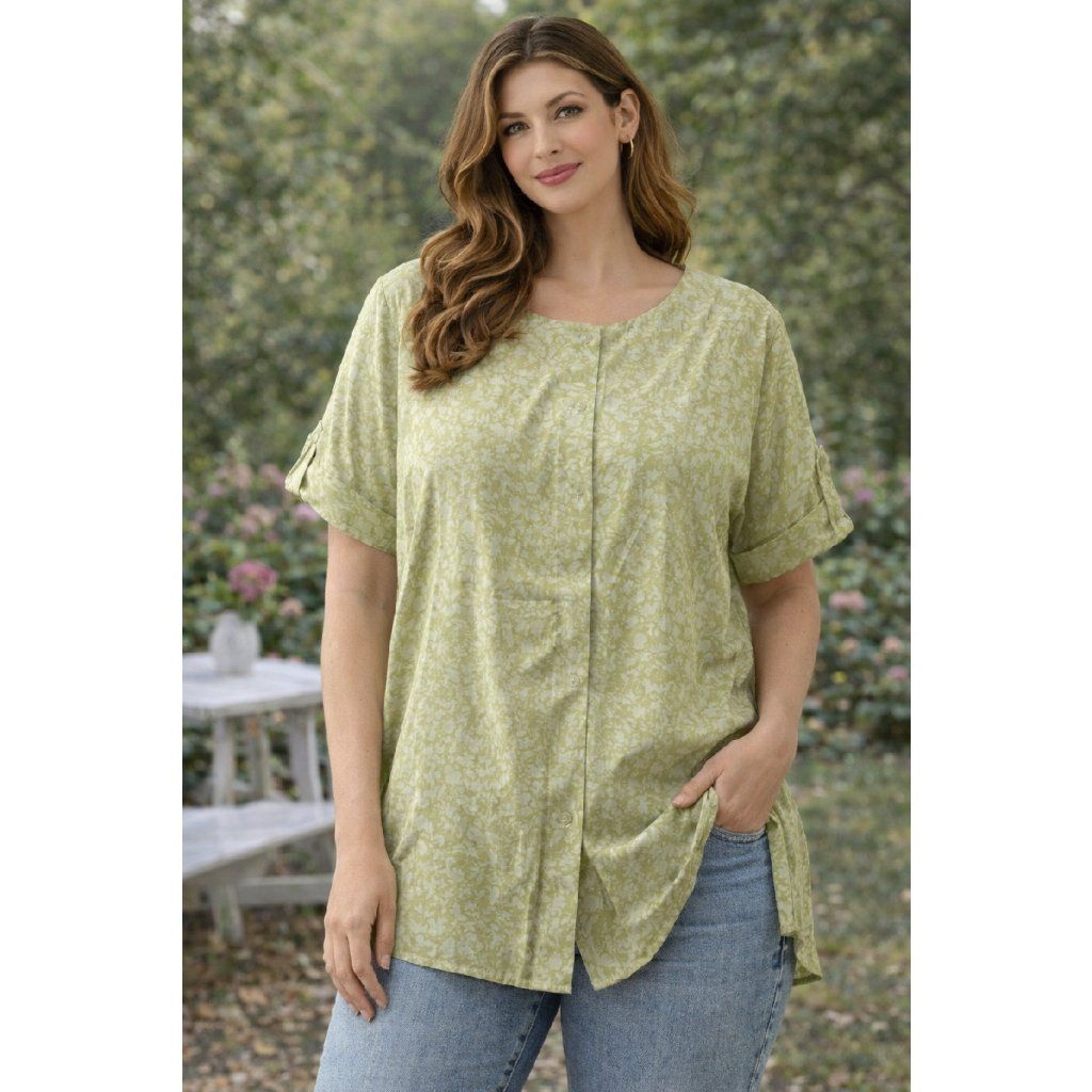 Lehká dámská halenka ve svěžím zeleném odstínu je ideální volbou pro pohodlné každodenní nošení. Volnější střih ve velikosti 44/46 krásně sedí, neobepíná postavu a zajišťuje maximální komfort. Jemný vzor dodává halence zajímavý vzhled, zatímco krátké rukávy a vzdušný materiál oceníte zejména v teplejších dnech.