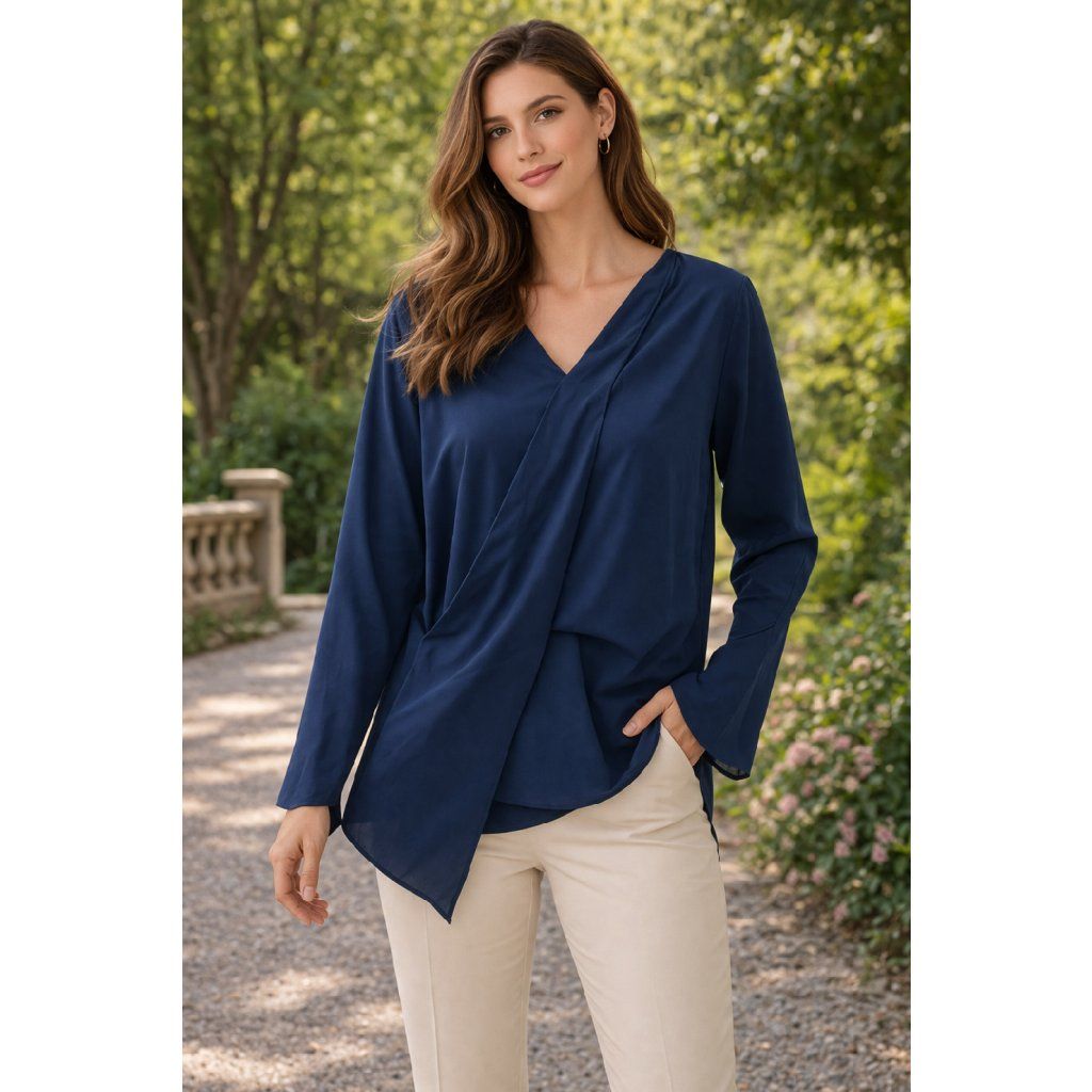 Elegantní dámská halenka v hluboké modré barvě zaujme svým moderním asymetrickým střihem a lehce splývavým materiálem. Díky volnějšímu střihu je velmi pohodlná na nošení a zároveň působí stylově a žensky.