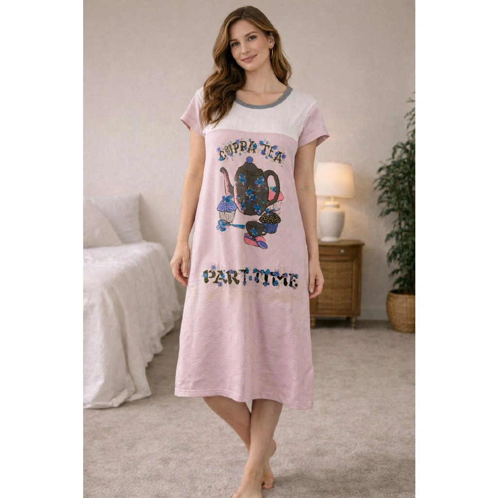 Dámská noční košilka pod kolena v jemném růžovém provedení je ideální volbou pro maximální komfort doma. Příjemný materiál, volnější střih a hravý potisk dodávají košilce nejen pohodlí, ale i roztomilý styl ✨