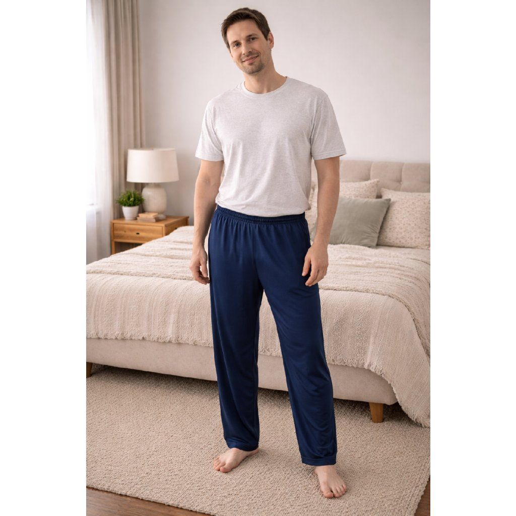 Tmavě modré domácí kalhoty ve velikosti M jsou ideální na odpočinek doma i klidné večery. Příjemný materiál, volný střih a maximální komfort bez zbytečností – prostě ideální kousek na pohodu 👍