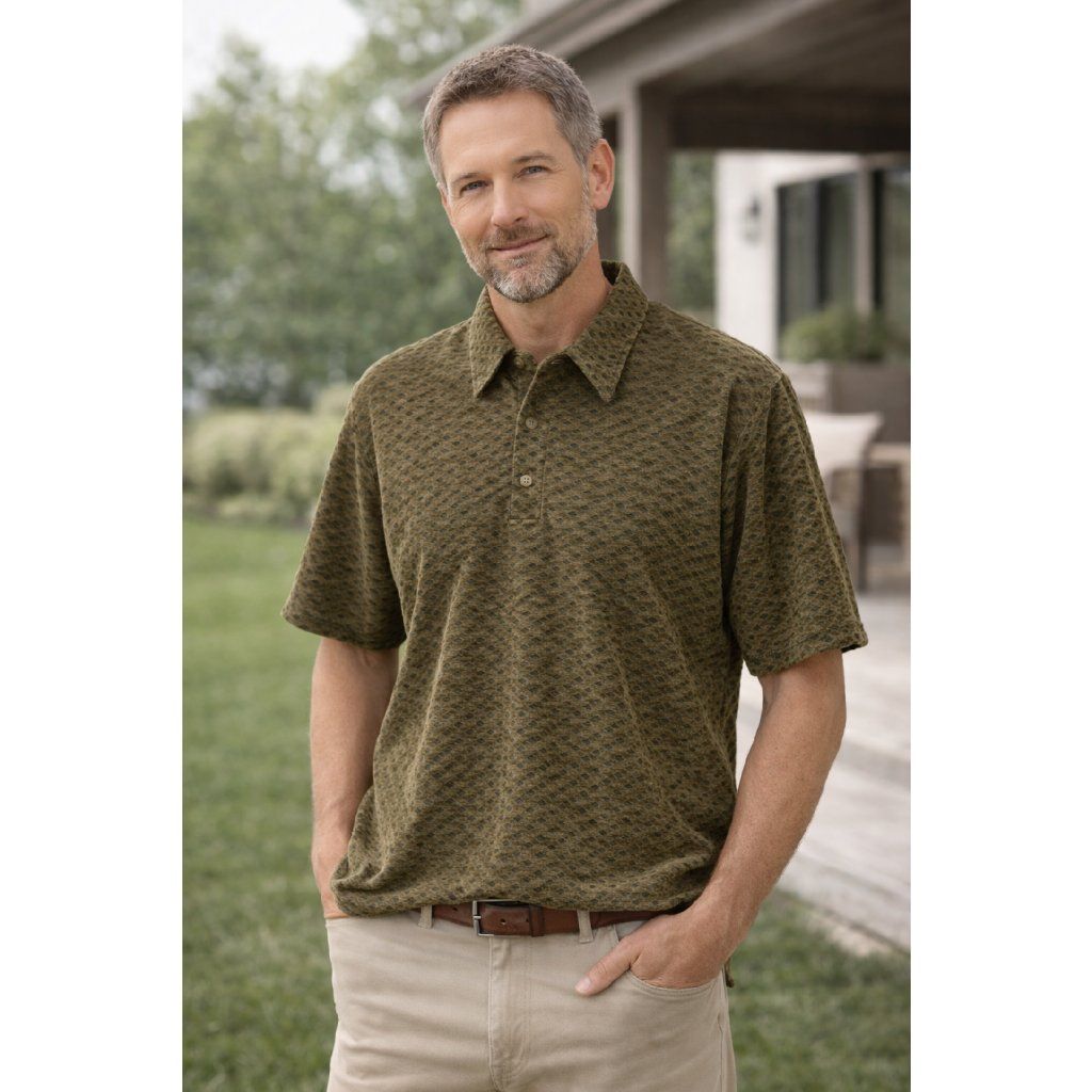 Pánské tričko v elegantním olivovém odstínu zaujme svým jemným strukturovaným vzorem, který dodává klasickému střihu moderní vzhled.