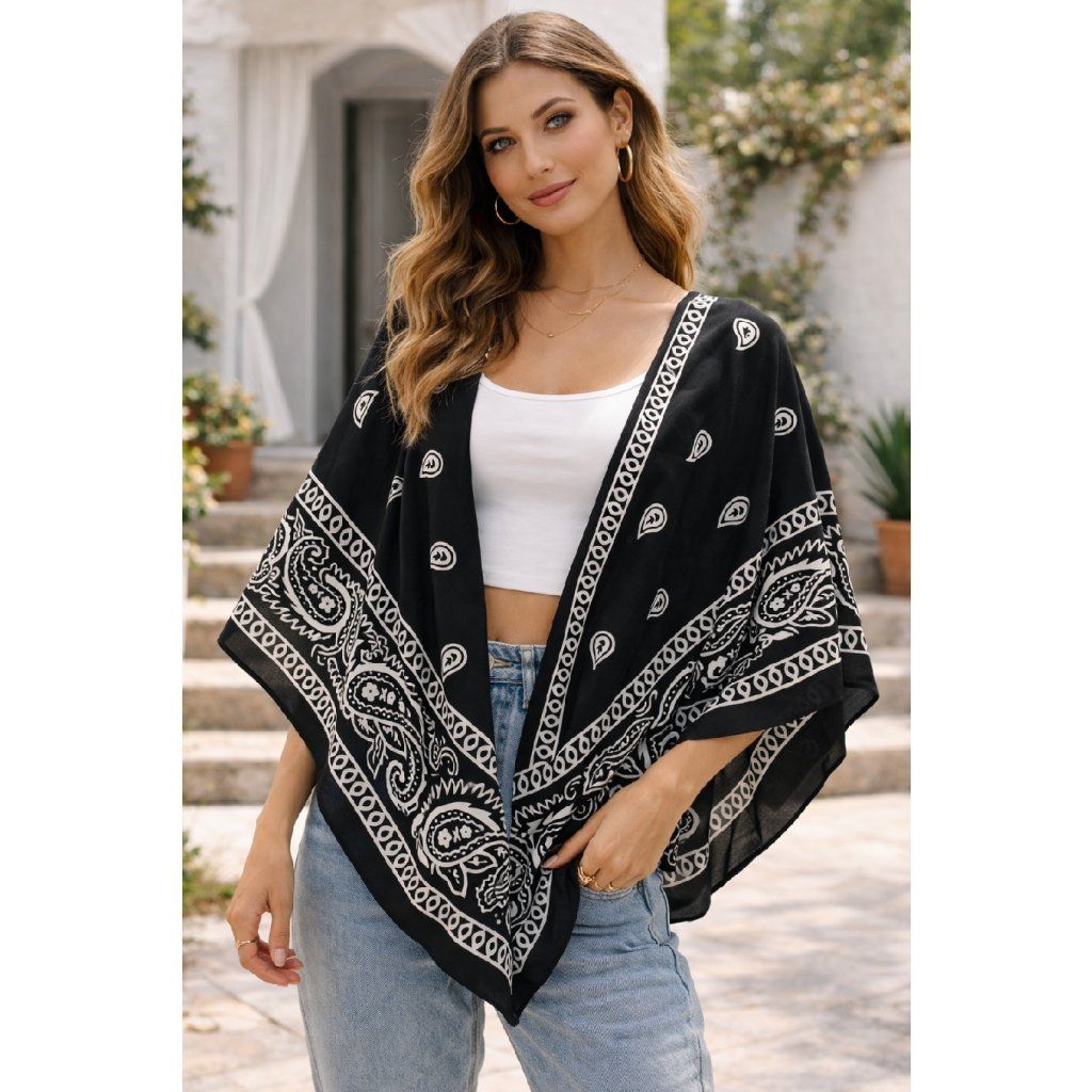 Stylový šátek s nadčasovým paisley vzorem 🖤 Lehký materiál a výrazný kontrast černé a bílé dodají každému outfitu šmrnc. Noste ho přes ramena, jako top nebo doplněk do vlasů – jeden kousek, nekonečno možností stylingu.