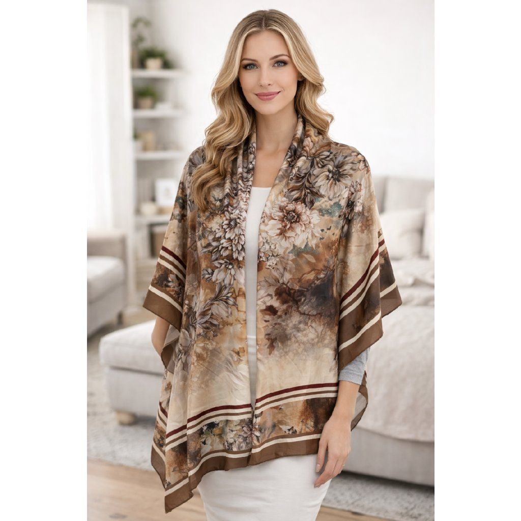 Elegantní dámský šátek v jemných béžovo-hnědých tónech s decentním květinovým vzorem dodá každému outfitu nádech sofistikovanosti.