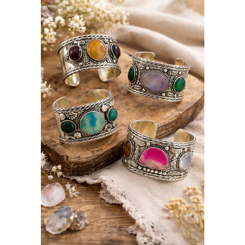 Stylové boho náramky s výraznými kameny a detailním zdobením jsou nepřehlédnutelným doplňkem pro každou milovnici originálních šperků. Kombinace kovového základu a barevných kamenů dodává každému kousku jedinečný charakter a šmrnc.