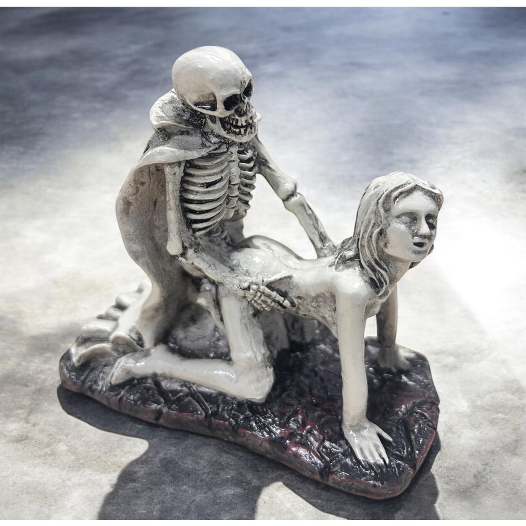 Tato gotická figurka působí jako provokativní symbol temné fantazie a memento mori. Kontrast mezi chladnou kostrou a živou lidskou postavou vytváří silný, až znepokojivý vizuální příběh o pomíjivosti, pokušení a tenké hranici mezi životem a smrtí. Bílá patina, zvýrazněné detaily kostí a dramatický podklad dodávají celé scéně sochařský, téměř galerijní charakter.