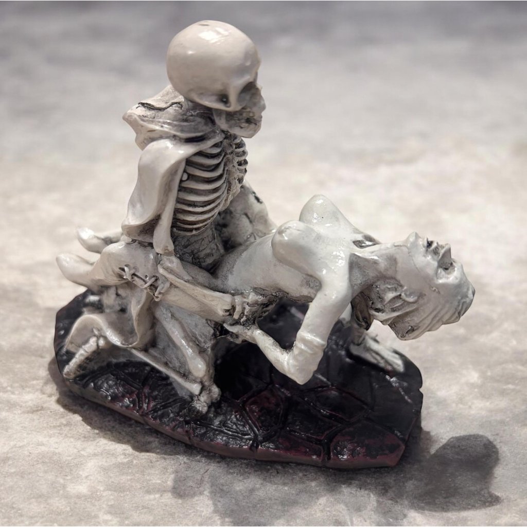Tato gotická figurka působí jako provokativní symbol temné fantazie a memento mori. Kontrast mezi chladnou kostrou a živou lidskou postavou vytváří silný, až znepokojivý vizuální příběh o pomíjivosti, pokušení a tenké hranici mezi životem a smrtí. Bílá patina, zvýrazněné detaily kostí a dramatický podklad dodávají celé scéně sochařský, téměř galerijní charakter.