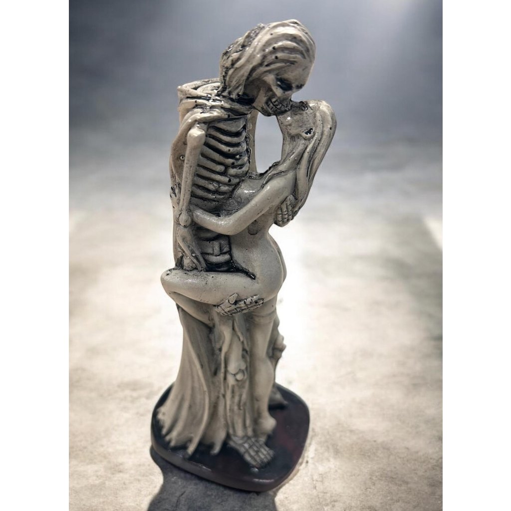 Tato gotická figurka působí jako provokativní symbol temné fantazie a memento mori. Kontrast mezi chladnou kostrou a živou lidskou postavou vytváří silný, až znepokojivý vizuální příběh o pomíjivosti, pokušení a tenké hranici mezi životem a smrtí. Bílá patina, zvýrazněné detaily kostí a dramatický podklad dodávají celé scéně sochařský, téměř galerijní charakter.