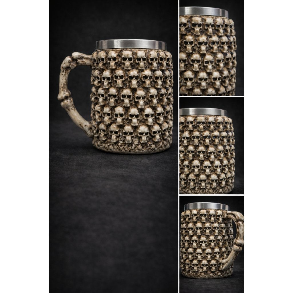 Tento nerezový hrnek s reliéfem lebek je nepřehlédnutelný kousek pro ty, kdo se nebojí temnější estetiky. Povrch tvořený desítkami drobných lebek vytváří silný vizuální dojem – připomíná starý oltář, válečný artefakt nebo relikvii z dávných časů. Každý detail je propracovaný tak, že hrnek působí masivně, syrově a autenticky.