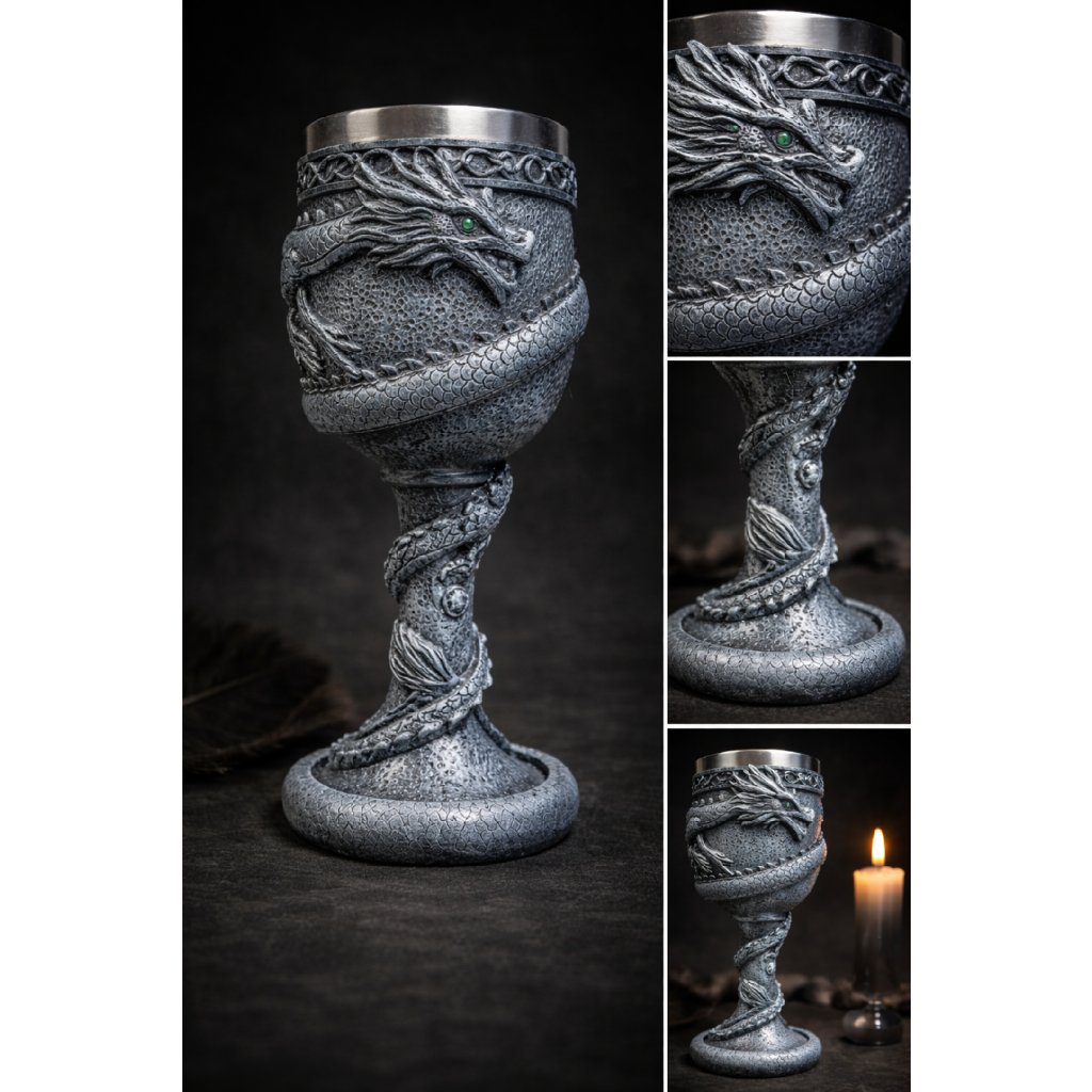 Drak zde není jen ozdobou, ale ochráncem obsahu poháru. Každý doušek z něj má atmosféru severských legend, starých run a zamrzlých hor. Nerezová vložka zajišťuje odolnost a snadnou údržbu, zatímco bohatě tvarovaný vnější plášť z něj dělá výrazný sběratelský kousek. Ideální pro milovníky fantasy, draků a temně laděné estetiky. ❄️🐉