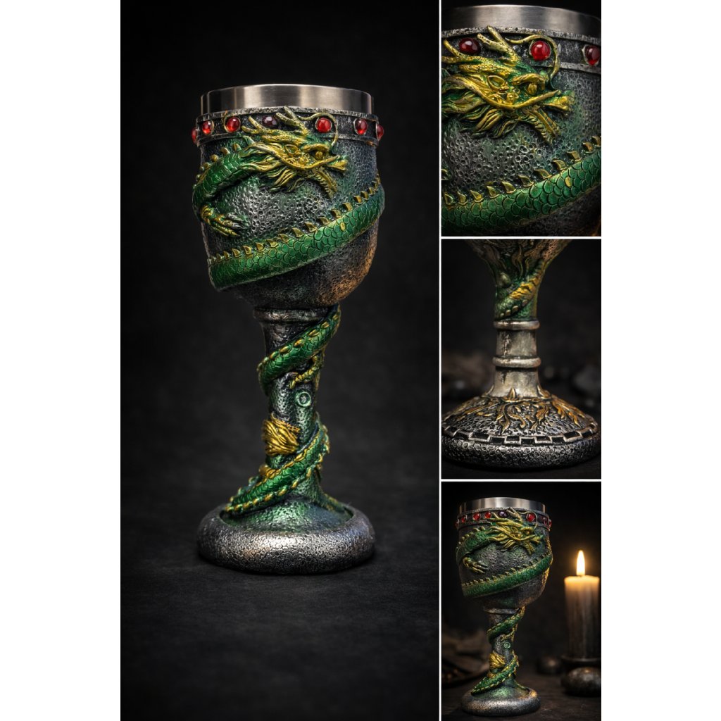 Tento nerezový pohár s motivem draka působí jako artefakt vytažený přímo z dračí sluje. Smaragdově zelené šupiny, zlaté detaily a červené kameny vsazené do horního lemu evokují sílu, moudrost a ochranu – vlastnosti, které jsou s draky spojovány napříč legendami a kulturami.