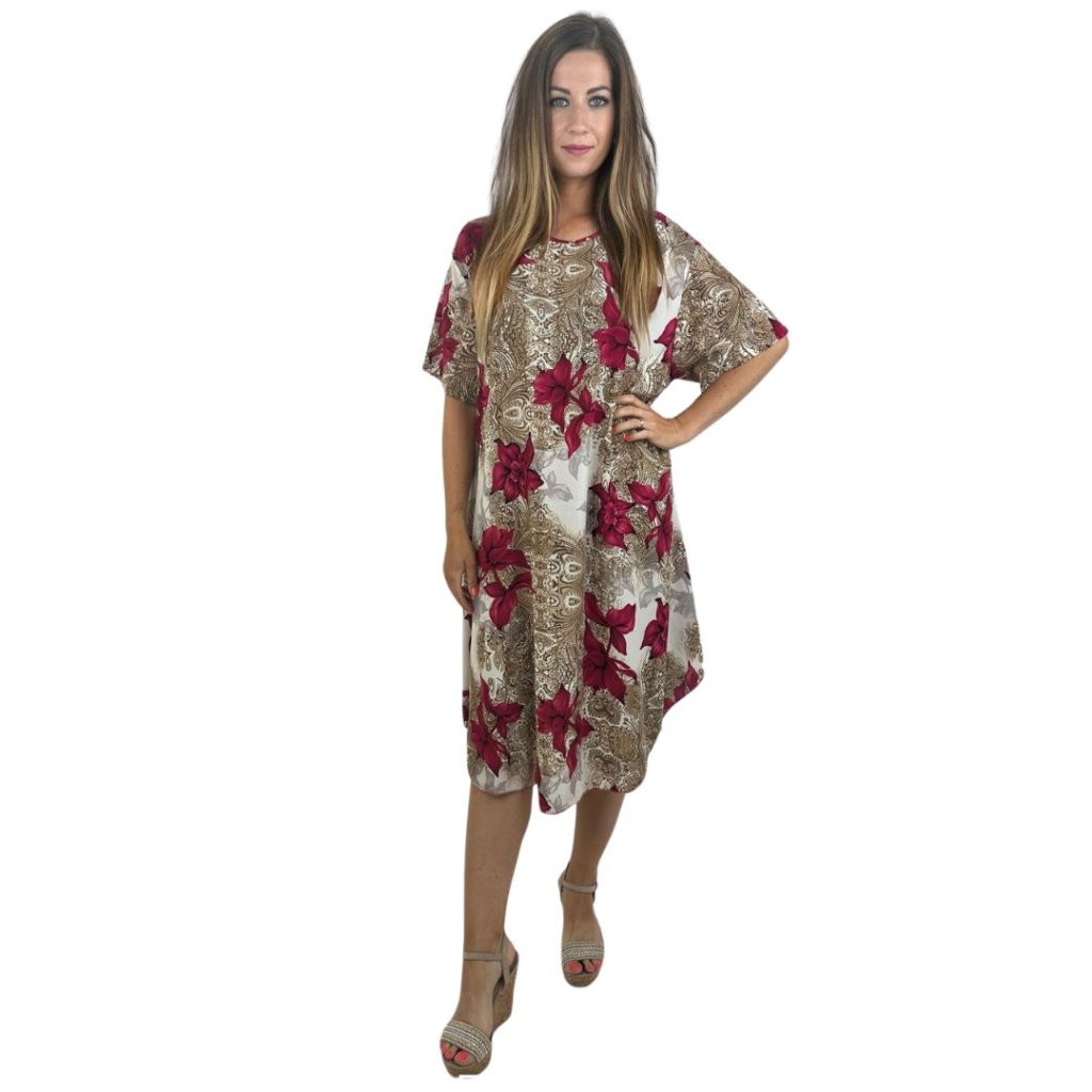 NOVINKA - Šaty s rukávky - vzorované béžové s červeným květem