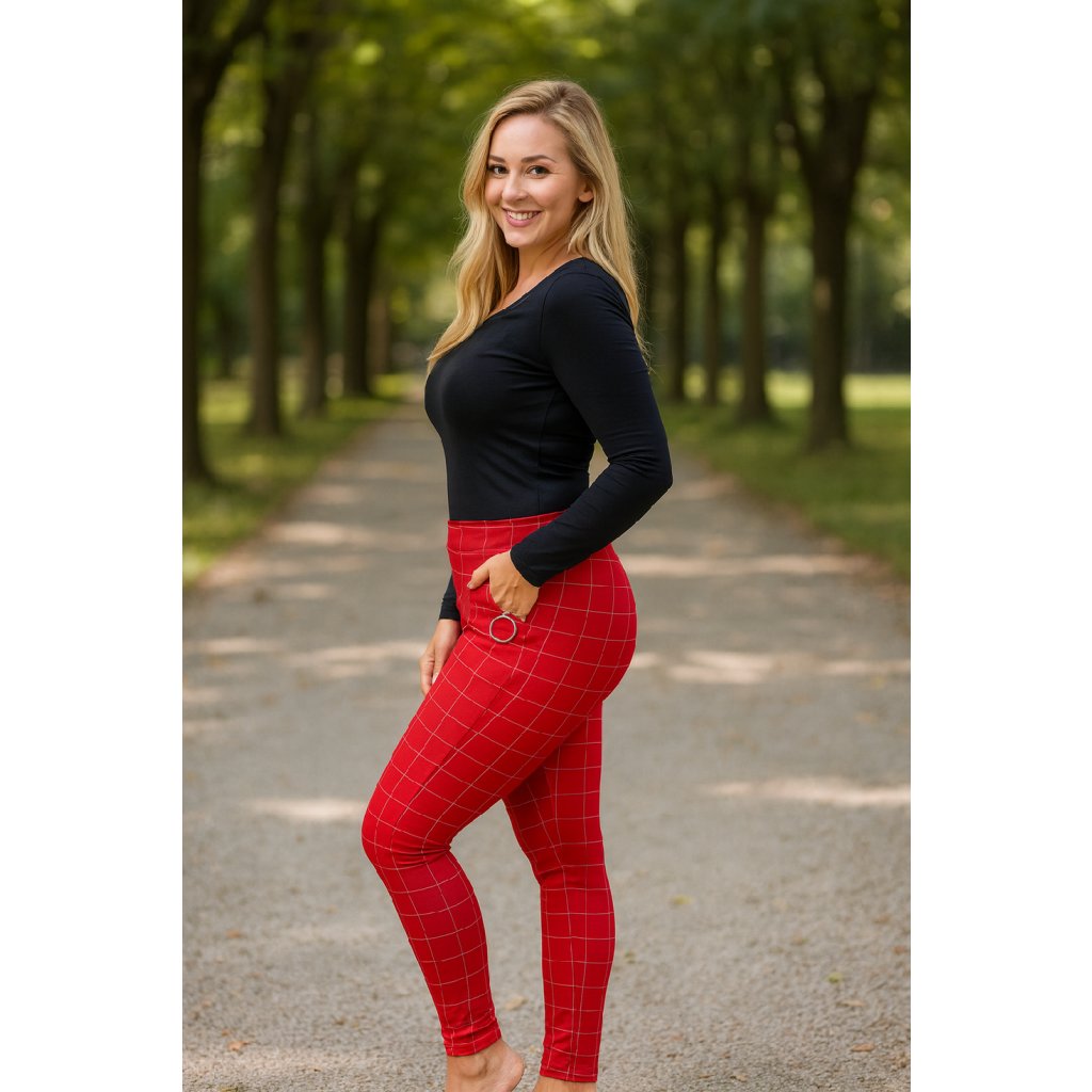 VÝPRODEJ-Dámské kostkované legíny - červené