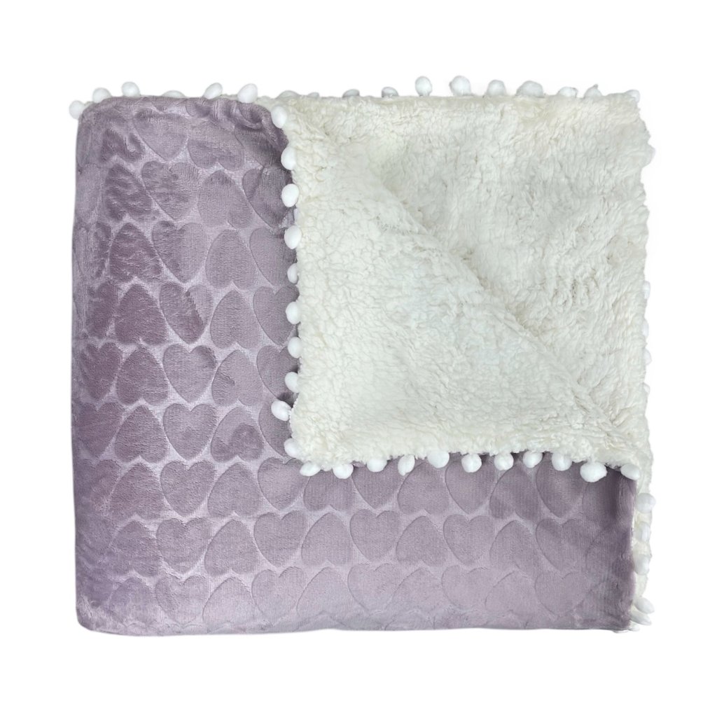 Beránková deka Srdíčka s bambulky 200 x 230 cm - Fialová