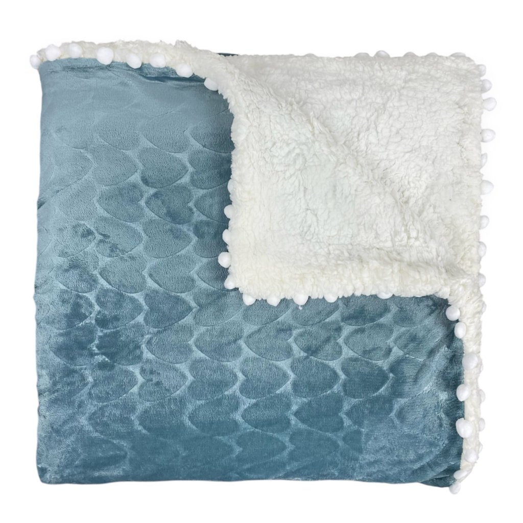 Beránková deka Srdíčka s bambulky 200 x 230 cm - Světle modrá