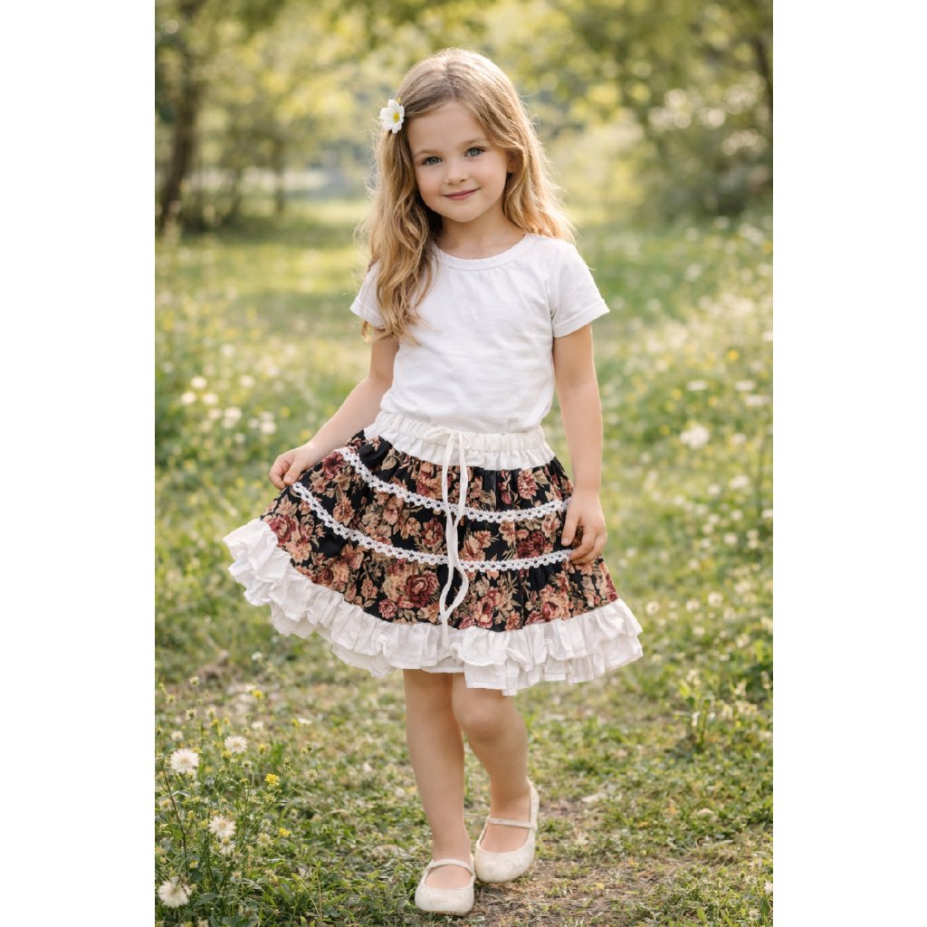 Roztomilá lehká sukýnka ideální na jaro a léto. Pružný pas se šňůrkou, volánky a jemná krajka dodávají sukýnce krásný romantický vzhled.