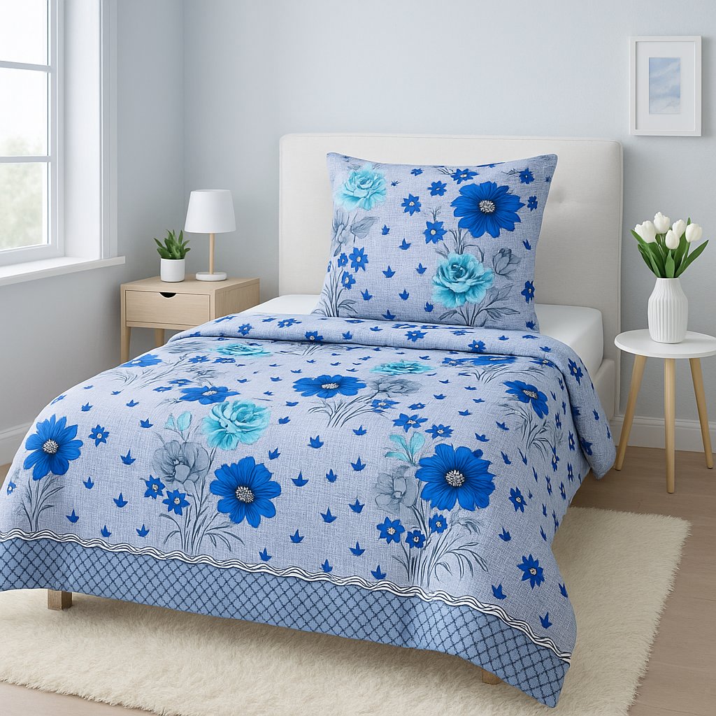Bavlněné povlečení, jednolůžko - Modré a zelené květy