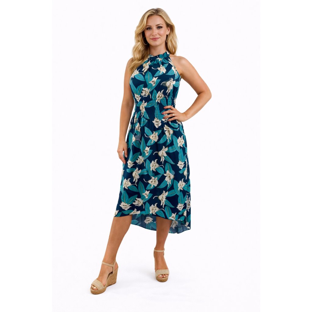 NEW-Summer dress with a tie around the neck - turquoise flowers