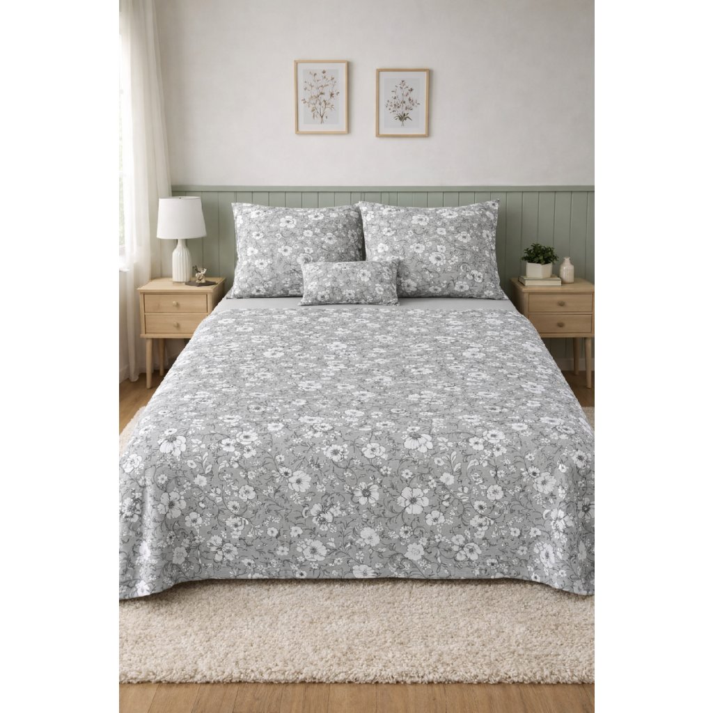 Francouzské bavlněné povlečení - Šedé s bílými květy