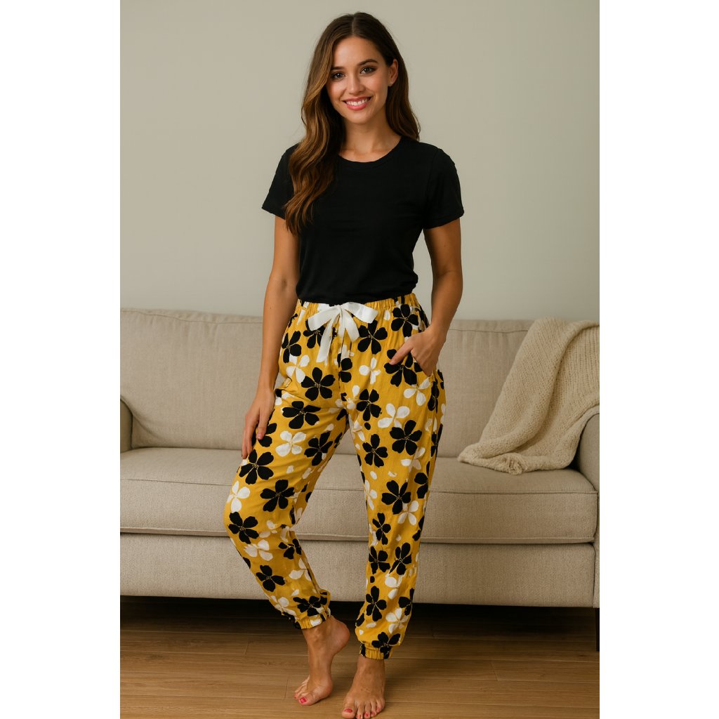 Veselé dámské kalhoty, domácí kalhoty RM2 - béžové s květy