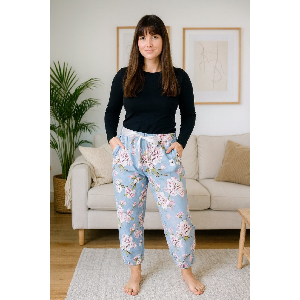 Veselé dámské kalhoty, domácí kalhoty RM2 - sv. modrá s květy