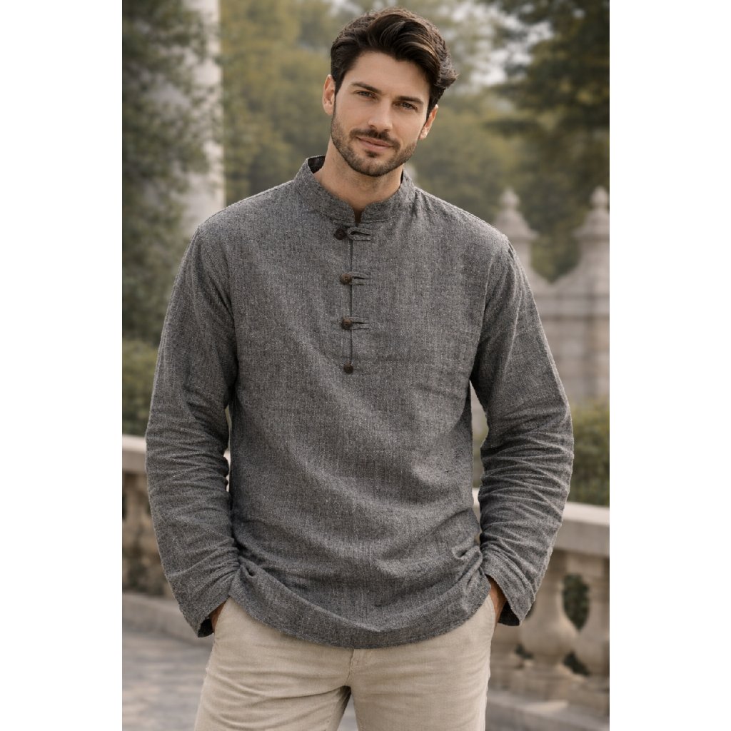 Pánská košile lněná tmavě šedá - kulatý knoflík ke krku
