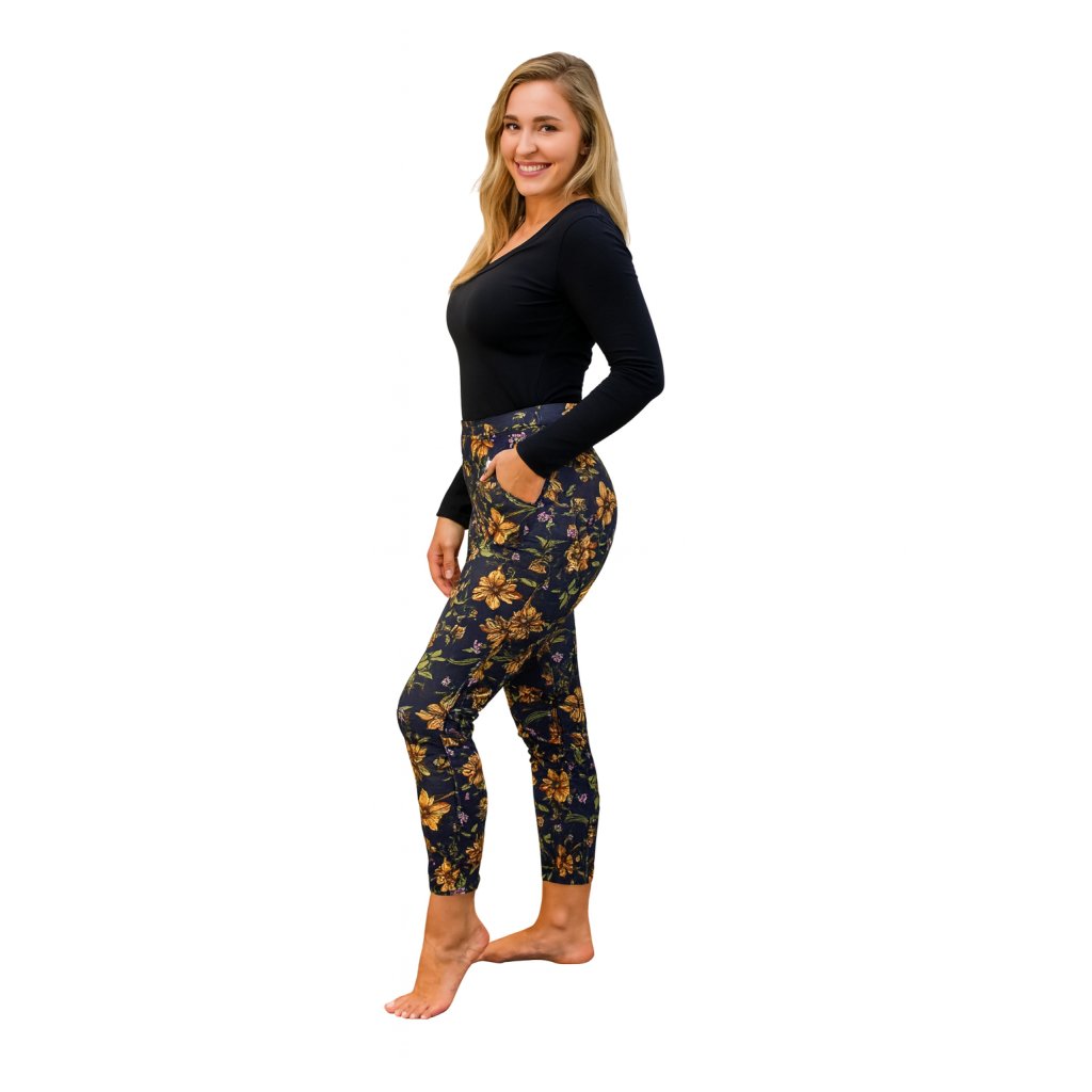 NOVINKA- Dámské dlouhé legíny černé s oranžovými květy a lístky