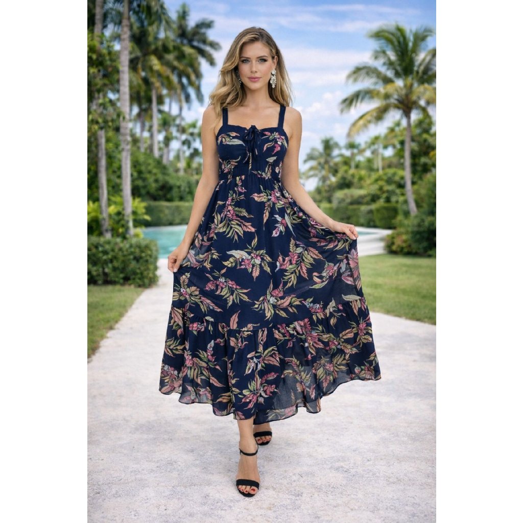 Letní šaty na ramínka s nabíranou sukní v černé barvě s květy.