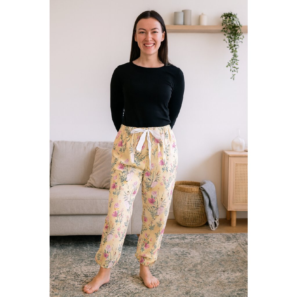 Veselé dámské kalhoty, domácí kalhoty RM2 - okrové s travinami