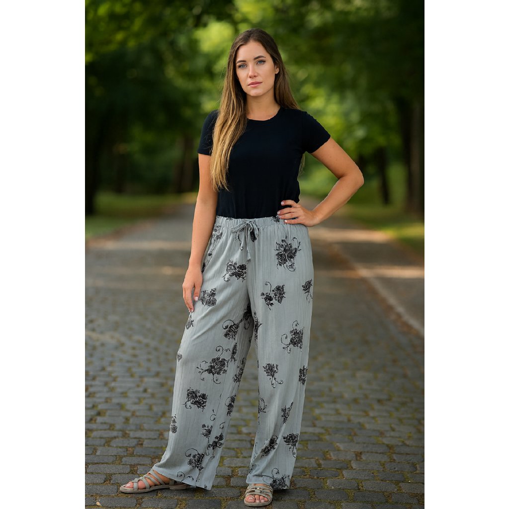 NOVINKA- Volné kalhoty s velkým květinovým vzorem - světle zelené